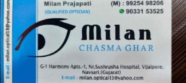 G- 1, Harmony Complex, Maneklal Road, near Sushrusha Hospital, Royal Township, Vejalpore, Navsari, Gujarat 396445. This optical store is one of the best optical of Vijalpore locality of Navsari run by a qualified optometrist.